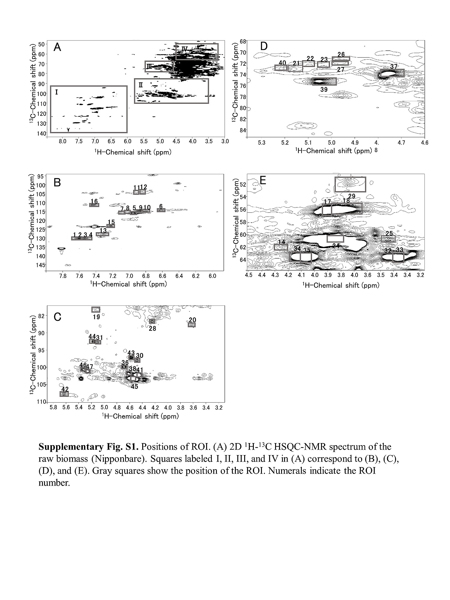 (A) 2D 1H-13C HSQC NMR spectrum of the raw biomass (Nipponbare). Squares I, II, III, and IV in (A) correspond to (B), (C), (D), and (E). Gray squares show the position of the ROI. Numerals indicate the ROI number.