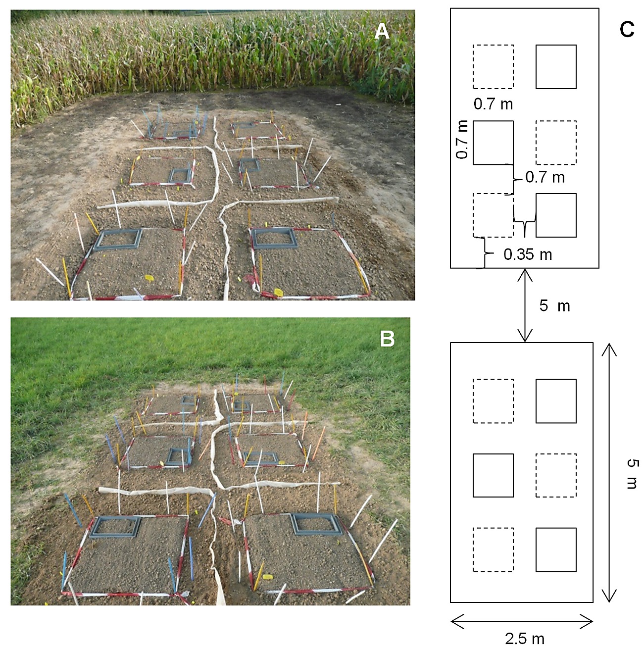 Pictures of the cropland (A), and grassland plot (B) associated with their respective diagrammatic representations (C and D). The two plots (2.5 × 5 m) were separated by a 5 meters pathway. Each plot was divided into 6 subplots of 0.49 m² (0.7 × 0.7), with 3 subplots amended with wheat straw (dotted line), and 3 unamended control subplots (full line). Grey squares in each subplot correspond to the fix part of gaz sampling chambers.