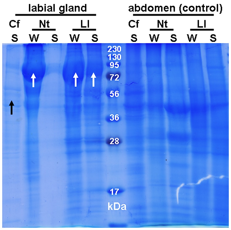 SDS-PAGE of labial gland extracts of workers (W) or soldiers (S). Coptotermes formosanus(Cf), Neocapritermes taracua (Nt), Labiotermes labralis (Ll). Controls made of a piece of abdomen were made for each species and caste. A black arrow indicates cellulase bands. A white arrow indicates class 1 allergen bands.
