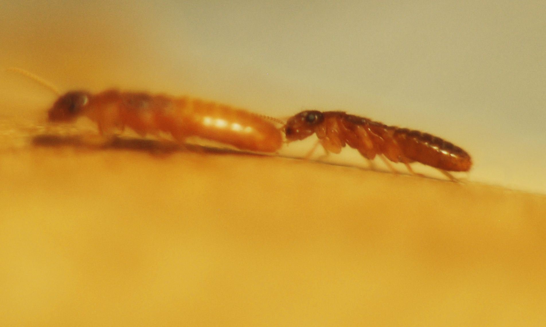 S1 Fig. Picture of tandem behavior between a female C. formosanus (left, large bright orange abdomen) and a male C. gestroi (right, small nutty brown abdomen) in the field.
