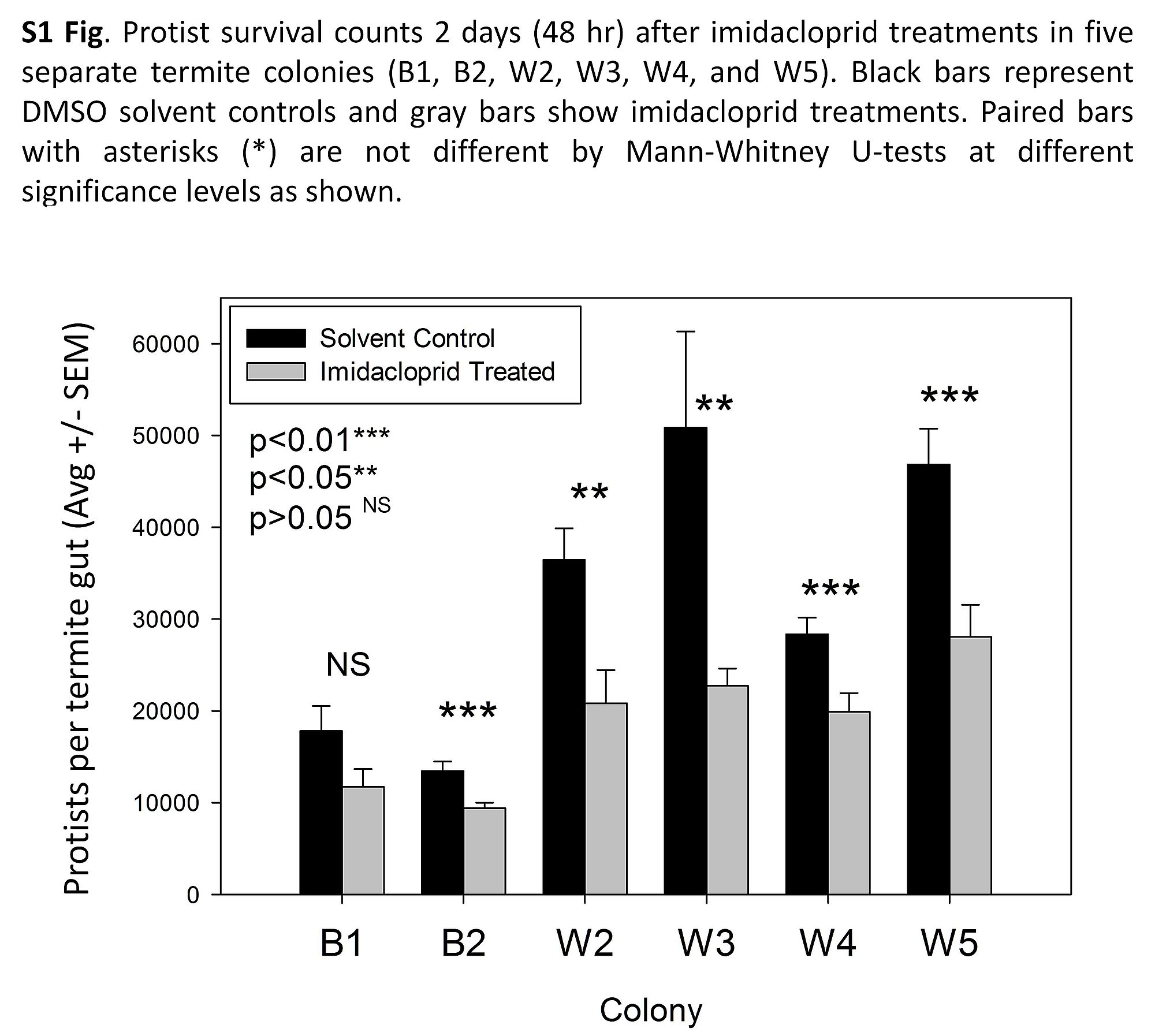 Protist survival counts 2 days (48 hr) after imidacloprid treatments in five separate termite colonies (B1, B2, W2, W3, W4, and W5). Black bars represent DMSO solvent controls and gray bars show imidacloprid treatments. Paired bars with asterisks (*) are not different by Mann-Whitney U-tests at different significance levels, as shown.