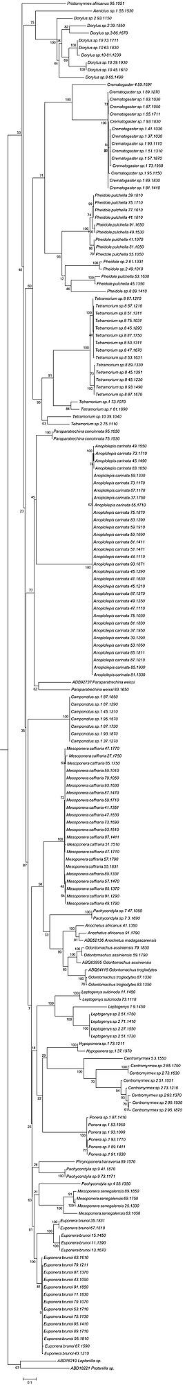 Phylogeny rooted to Leptanilla sp. and Protanilla sp. Node values give bootstrap support. Scale bar represents substitutions per site based on the GTR+I+G model. Note that three ant species were not sequenced, only morphologically determined, and so these are not included in the phylogeny.