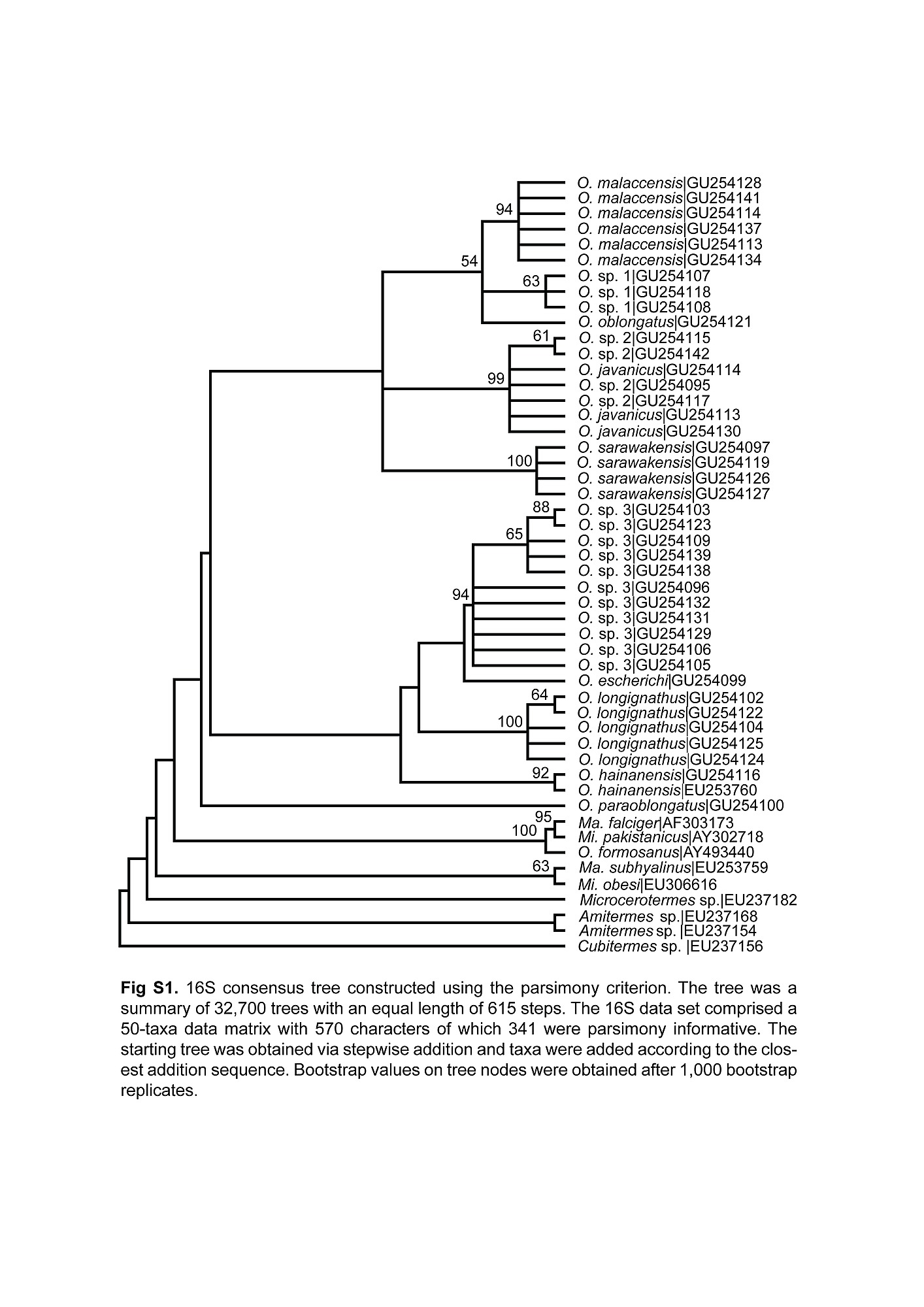 The clades in the trees in Figures 2 to 4 sometimes contained a single termite species, and in other cases two or more species. To a large extent, species recognised using the gene trees were similar to those recognised by morphology. Identifications using soldier morphologies yielded nine species, while the existence of at least eleven species was inferred from the phylogenetic trees. However, before we reconstructed the phylogenetic trees, we suspected that there were samples we had initially identified as O. sarawakensis that were slightly different in morphology. After reconstructing their phylogenies, it became apparent that the samples were genetically distinct. The first sample was identified as O. hainanensis after it was found clustering with a GenBank sequence of O. hainanensis in the 16S and cyt1 trees while the other was later identified as O. escherichi (Holmgren) when it consistently resolved separately from the rest of the samples (Figures 2 & 3).