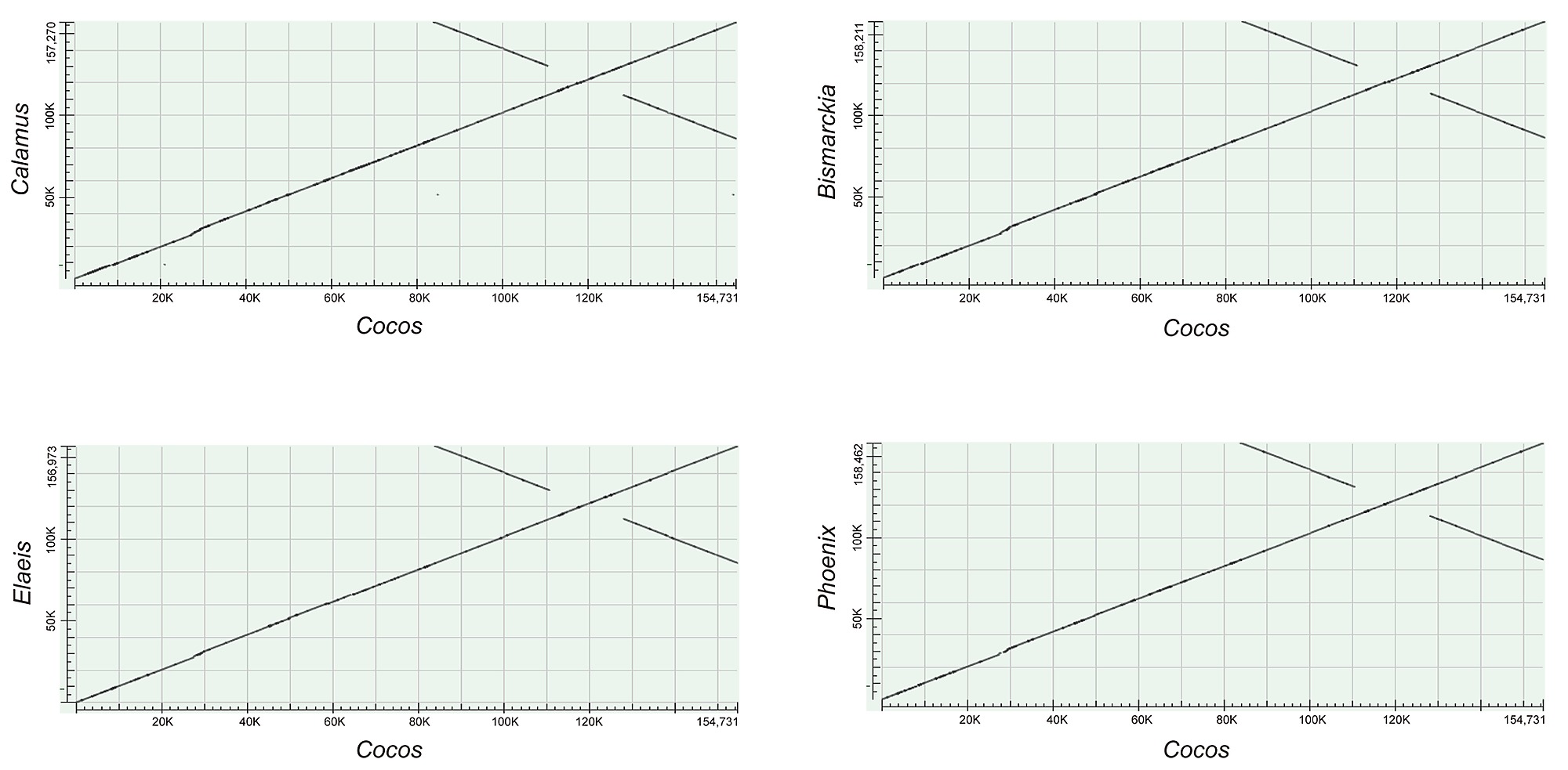 Dot plot analysis. The cp genomes are nearly identical in the palm family.