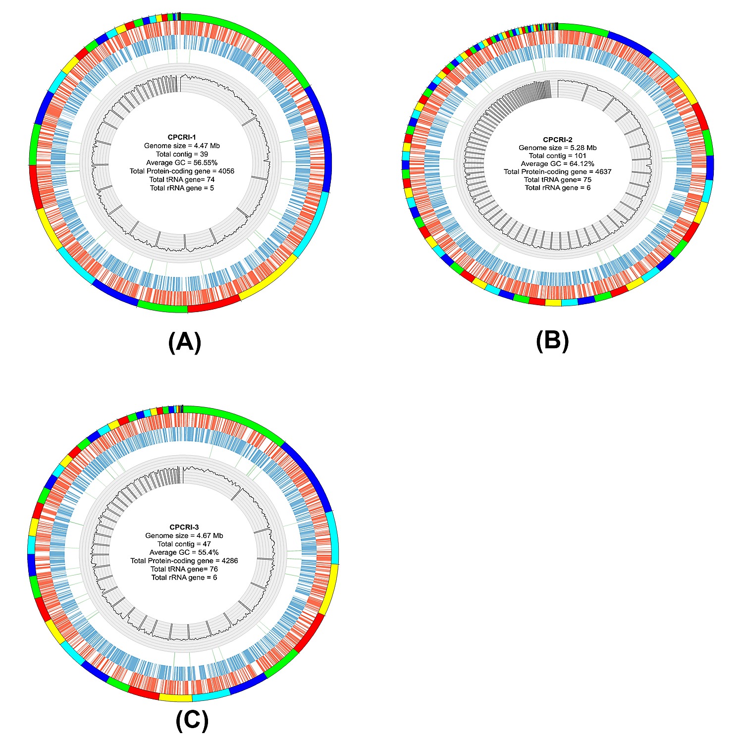 CPCRI genomes. Circos plot representing the CPCRI-1 (A), CPCRI-2 (B) and CPCRI-3 (C) genomes. The innermost circle represents the GC content, the second circle from the innermost circle represent non-coding genes, the third circle from inside represents coding genes on negative strand, the fourth circle represents coding genes on positive strand, and the outermost circle represent contigs.