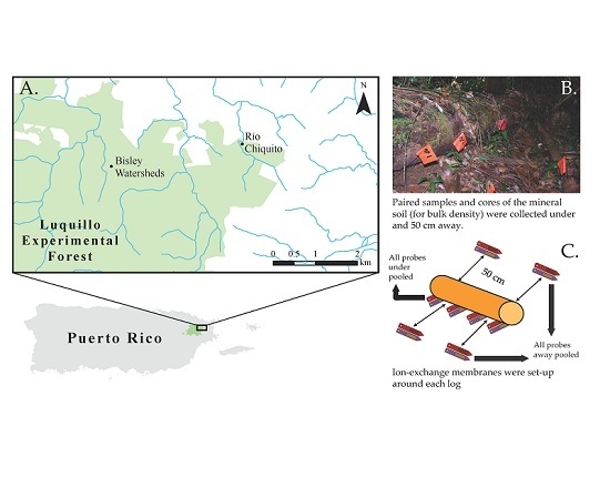 Keywords: coarse woody debris (CWD); wood decomposition; soil properties; available nutrients; roots; microbial biomas; tropical forest; Puerto Rico