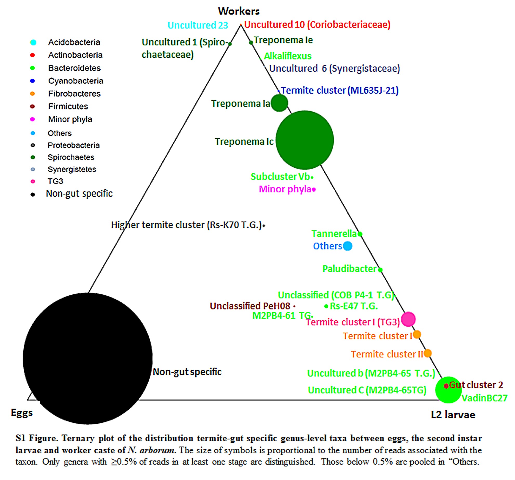S1 Fig. Ternary plot of the distribution termite-gut specific genus-level taxa between eggs, the second instar larvae and worker caste of N. arborum.