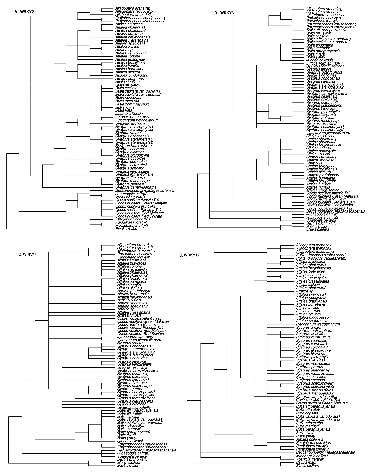 We present the results of combined analysis of DNA sequences of seven WRKY transcription factor loci across 72 samples of Arecaceae tribe Cocoseae subtribe Attaleinae, representing all genera classified within the subtribe, and three outgroup taxa with maximum parsimony, maximum likelihood, and Bayesian approaches, producing highly congruent and well-resolved trees that robustly identify the genus Syagrus as sister to Cocos and resolve novel and well-supported relationships among the other genera of the Attaleinae. We also address incongruence among the gene trees with gene tree reconciliation analysis, and assign estimated ages to the nodes of our tree.