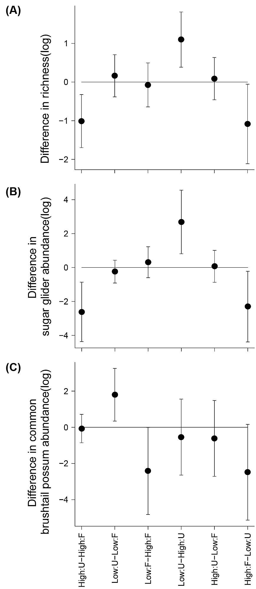 Differences in mean levels of multiple comparison tests. (A) Species richness, (B) sugar glider abundance, and (C) common brushtail possum abundance in log scale of multiple comparisons of edge contrast and land cover combinations. Codes of edge contrasts: High = high housing density; Low = low housing density. Codes of land cover: F = forest; U = urban. Bars represent 90% confidence intervals. When confidence intervals do not overlap zero, means between comparison levels are different at a significance level of 0.1.