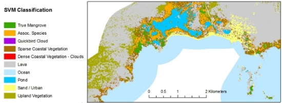 Mangroves provide valuable ecosystem goods and services such as carbon sequestration, habitat for terrestrial and marine fauna, and coastal hazard mitigation. The use of satellite remote sensing to map mangroves has become widespread as it can provide accurate, efficient, and repeatable assessments. Traditional remote sensing approaches have failed to accurately map fringe mangroves and true mangrove species due to relatively coarse spatial resolution and/or spectral confusion with landward vegetation. This study demonstrates the use of the new Worldview-2 sensor, Object-based image analysis (OBIA), and support vector machine (SVM) classification to overcome both of these limitations. An exploratory spectral separability showed that individual mangrove species could not be spectrally separated, but a distinction between true and associate mangrove species could be made. An OBIA classification was used that combined a decision-tree classification with the machine-learning SVM classification. Results showed an overall accuracy greater than 94% (kappa = 0.863) for classifying true mangroves species and other dense coastal vegetation at the object level. There remain serious challenges to accurately mapping fringe mangroves using remote sensing data due to spectral similarity of mangrove and associate species, lack of clear zonation between species, and mixed pixel effects, especially when vegetation is sparse or degraded. View Full-Text