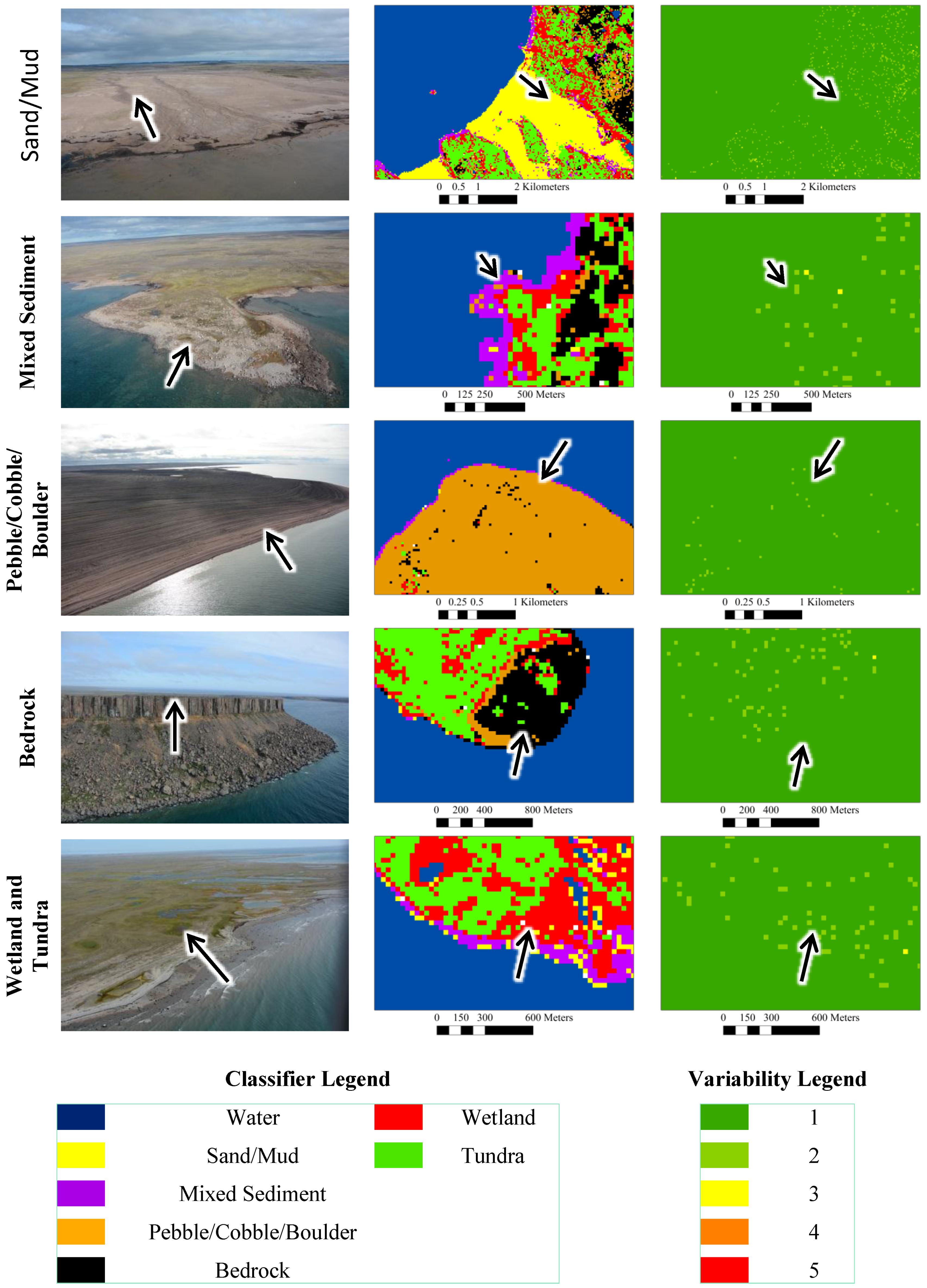 The Random Forest algorithm was used to classify 86 Wide Fine Quadrature Polarized RADARSAT-2 scenes, five Landsat 5 scenes, and a Digital Elevation Model covering an area approximately 81,000 km2 in size, and representing the entirety of Dease Strait, Coronation Gulf and Bathurst Inlet, Nunavut. The focus of this research was to assess the potential to operationalize shoreline sensitivity mapping to inform oil spill response and contingency planning. The impact of varying the training sample size and reducing model data load were evaluated. Results showed that acceptable accuracies could be achieved with relatively few training samples, but that higher accuracies and greater probabilities of correct class assignment were observed with larger sample sizes. Additionally, the number of inputs to the model could be greatly reduced without impacting overall performance. Optimized models reached independent accuracies of 91% for seven land cover types, and classification probabilities between 0.77 and 0.98 (values for latter represent per-class averages generated from independent validation sites). Mixed results were observed when assessing the potential for remote predictive mapping by simulating transferability of the model to scenes without training data. View Full-Text