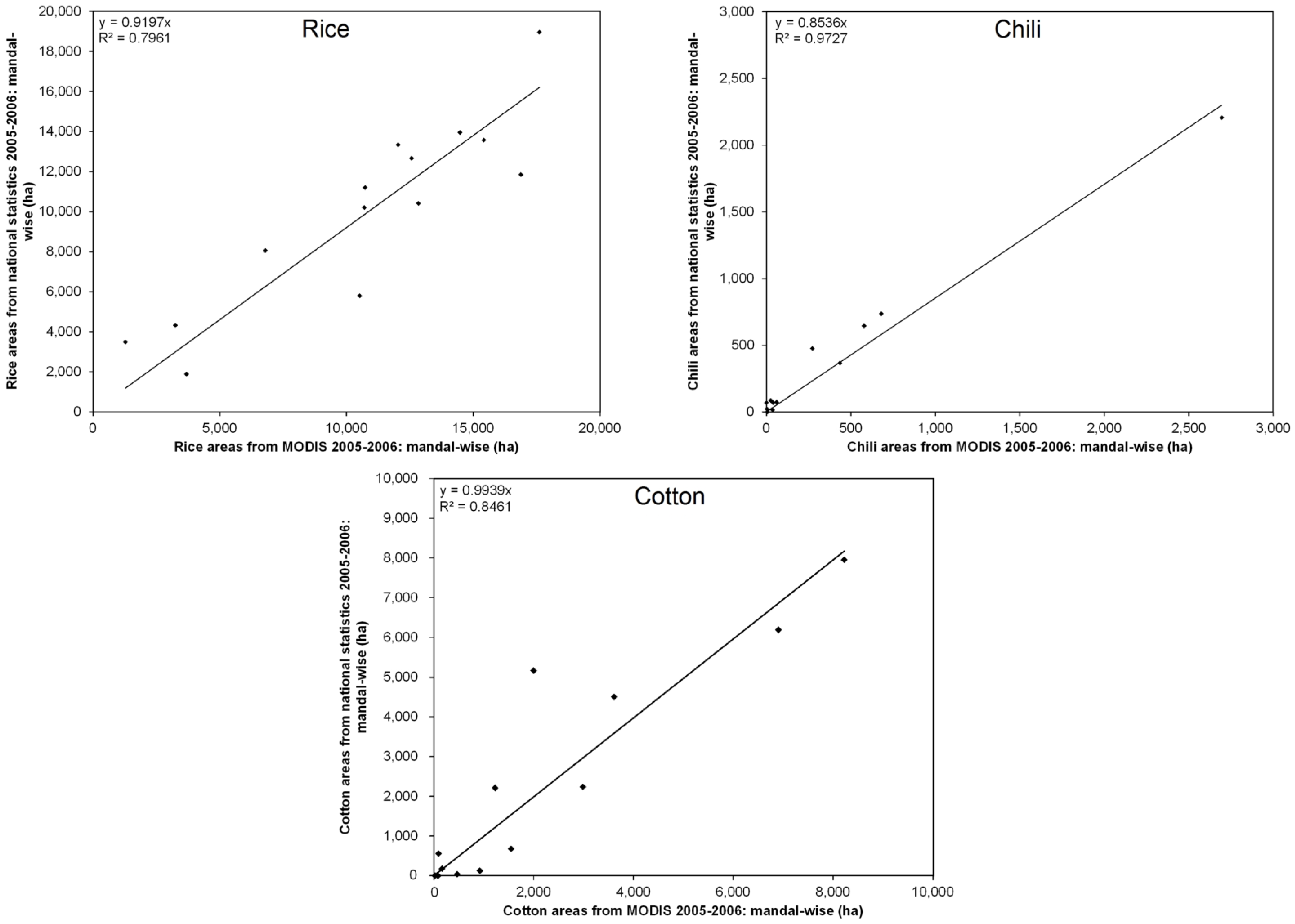 This paper describes an approach to accurately separate out and quantify crop dominance areas in the major command area in the Krishna River Basin. Classification was performed using IRS-P6 (Indian Remote Sensing Satellite, series P6) and MODIS eight-day time series remote sensing images with a spatial resolution of 23.6 m, 250 m for the year 2005. Temporal variations in the NDVI (Normalized Difference Vegetation Index) pattern obtained in crop dominance classes enables a demarcation between long duration crops and short duration crops. The NDVI pattern was found to be more consistent in long duration crops than in short duration crops due to the continuity of the water supply. Surface water availability, on the other hand, was dependent on canal water release, which affected the time of crop sowing and growth stages, which was, in turn, reflected in the NDVI pattern. The identified crop-wise classes were tested and verified using ground-truth data and state-level census data. The accuracy assessment was performed based on ground-truth data through the error matrix method, with accuracies from 67% to 100% for individual crop dominance classes, with an overall accuracy of 79% for all classes. The derived major crop land areas were highly correlated with the sub-national statistics with R2 values of 87% at the mandal (sub-district) level for 2005–2006. These results suggest that the methods, approaches, algorithms and datasets used in this study are ideal for rapid, accurate and large-scale mapping of paddy rice, as well as for generating their statistics over large areas. This study demonstrates that IRS-P6 23.6-m one-time data fusion with MODIS 250-m time series data is very useful for identifying crop type, the source of irrigation water and, in the case of surface water irrigation, the way in which it is applied. The results from this study have assisted in improving surface water and groundwater irrigated areas of the command area and also provide the basis for better water resource assessments at the basin scale. View Full-Text