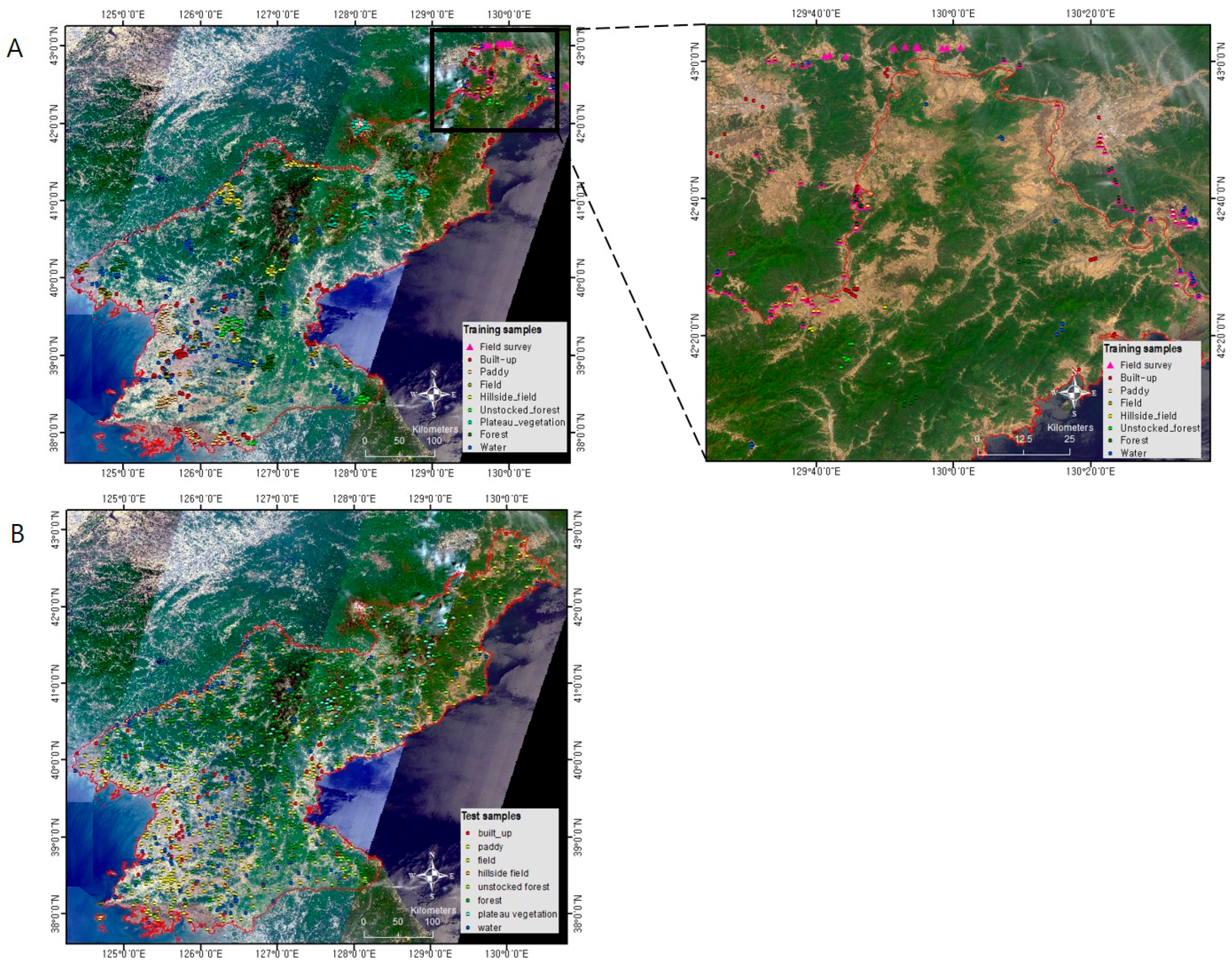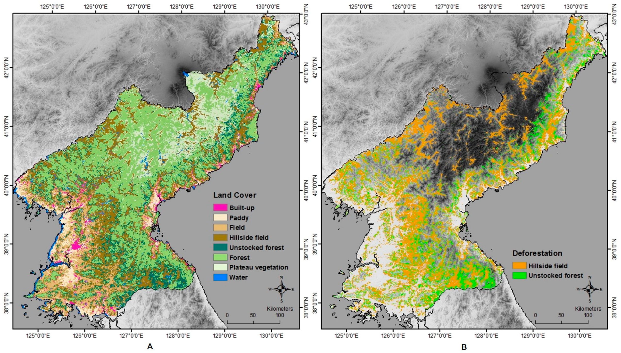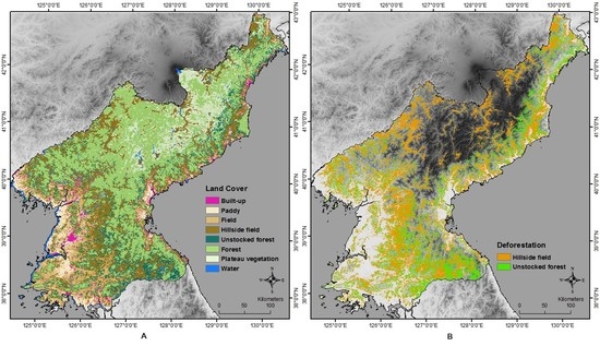 Phenology-based multi-index with the random forest (RF) algorithm can be used to overcome the shortcomings of traditional deforestation mapping that involves pixel-based classification, such as ISODATA or decision trees, and single images. The purpose of this study was to investigate methods to identify specific types of deforestation in North Korea, and to increase the accuracy of classification, using phenological characteristics extracted with multi-index and random forest algorithms. The mapping of deforestation area based on RF was carried out by merging phenology-based multi-indices (i.e., normalized difference vegetation index (NDVI), normalized difference water index (NDWI), and normalized difference soil index (NDSI)) derived from MODIS (Moderate Resolution Imaging Spectroradiometer) products and topographical variables. Our results showed overall classification accuracy of 89.38%, with corresponding kappa coefficients of 0.87. In particular, for forest and farm land categories with similar phenological characteristic (e.g., paddy, plateau vegetation, unstocked forest, hillside field), this approach improved the classification accuracy in comparison with pixel-based methods and other classes. The deforestation types were identified by incorporating point data from high-resolution imagery, outcomes of image classification, and slope data. Our study demonstrated that the proposed methodology could be used for deciding on the restoration priority and monitoring the expansion of deforestation areas. View Full-Text