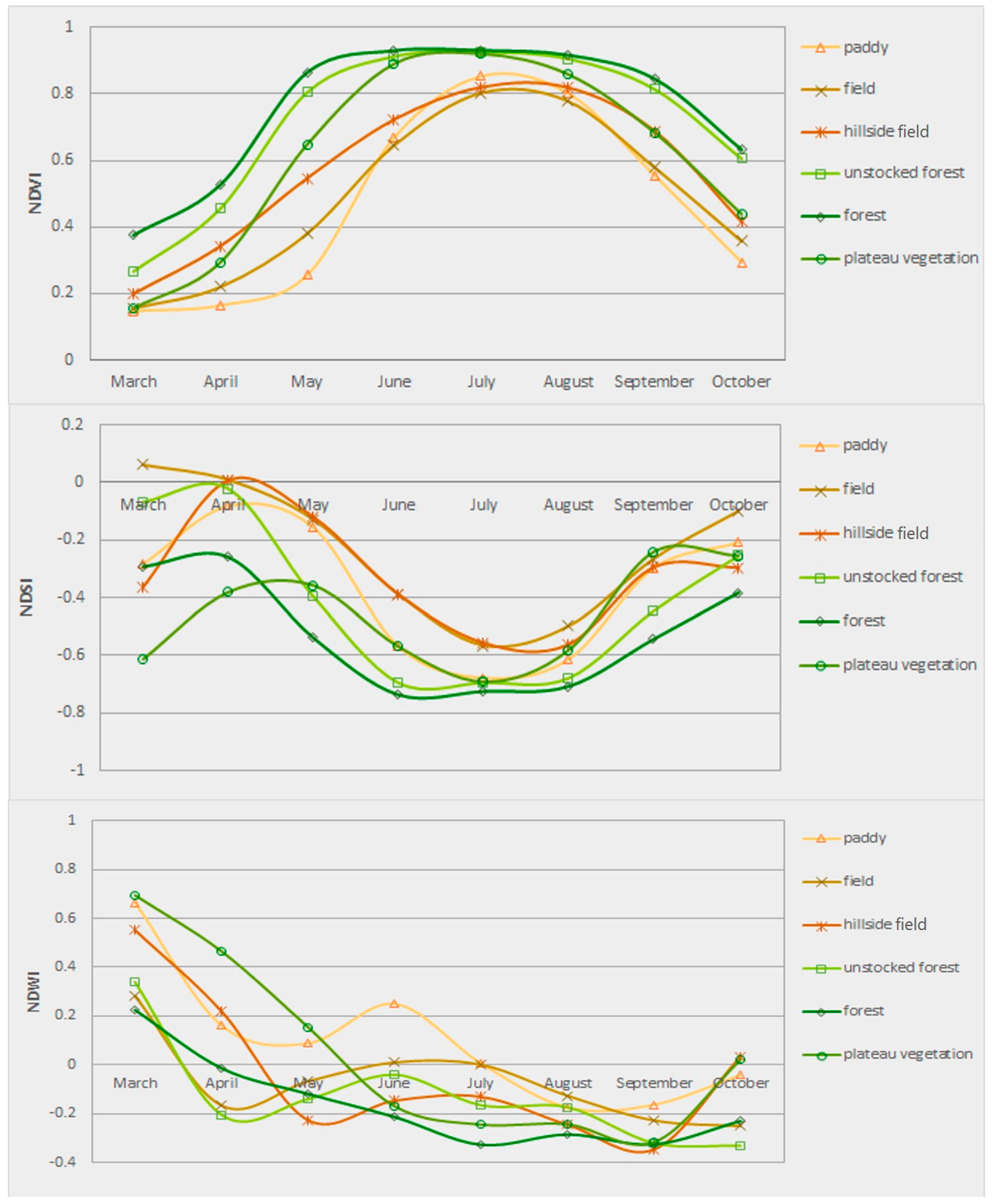 Keywords: NDVI; NDSI; NDWI; unstocked forest; hillside field; vegetation phenology; MODIS