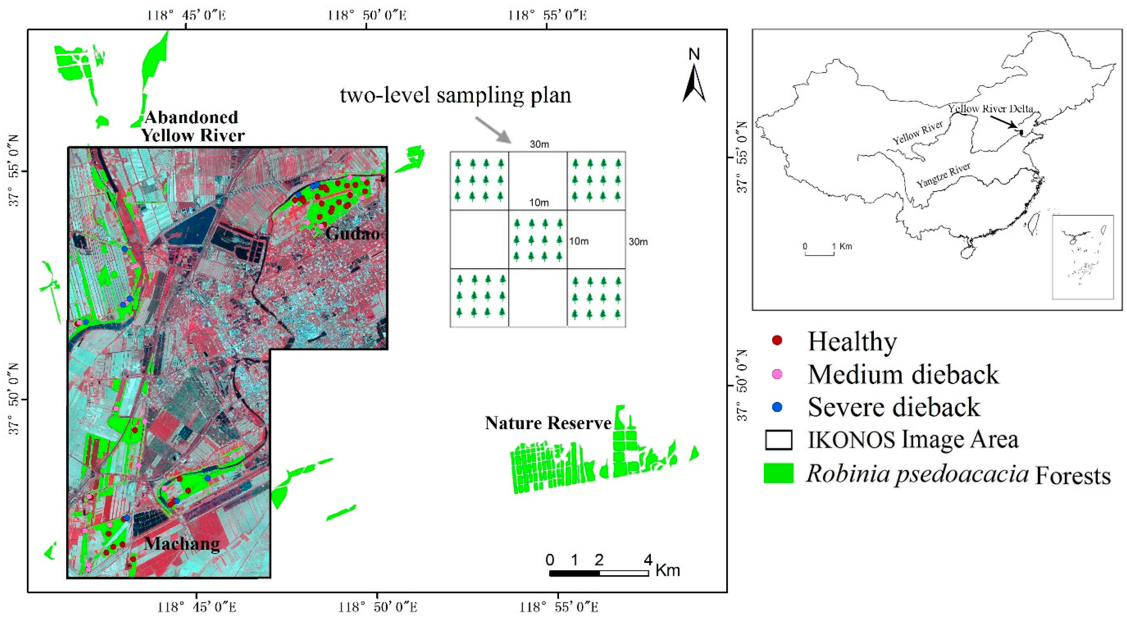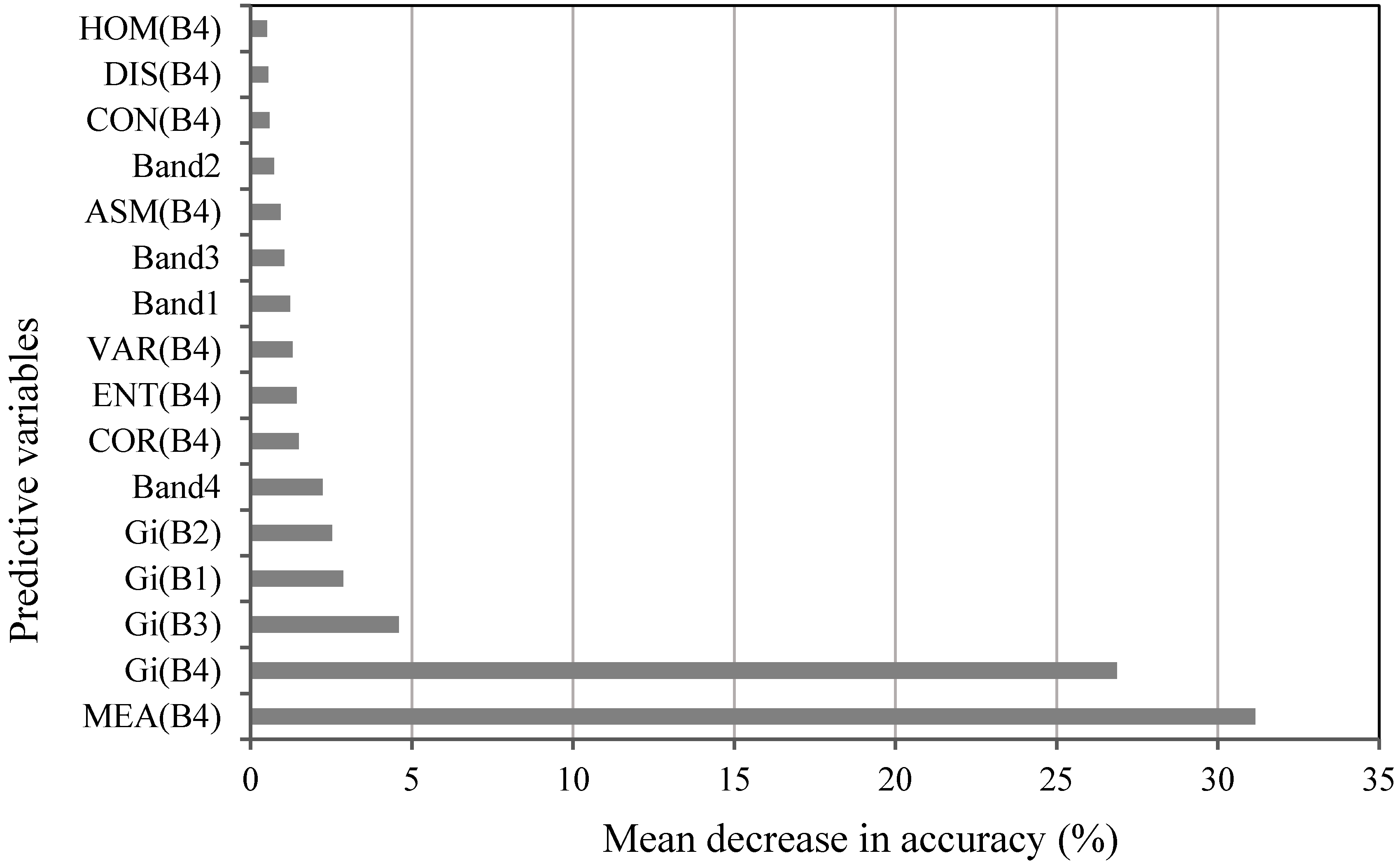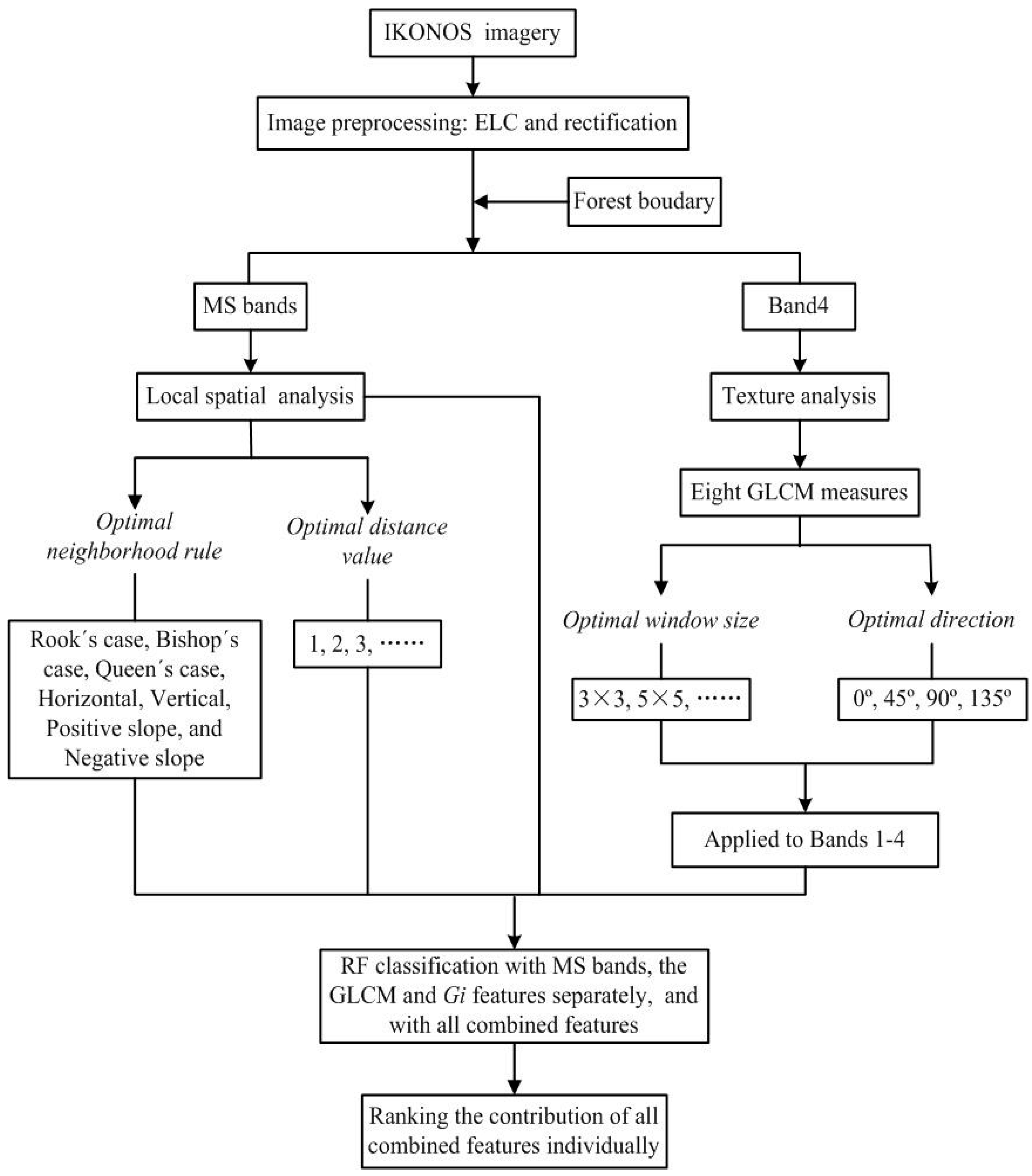 The textural and spatial information extracted from very high resolution (VHR) remote sensing imagery provides complementary information for applications in which the spectral information is not sufficient for identification of spectrally similar landscape features. In this study grey-level co-occurrence matrix (GLCM) textures and a local statistical analysis Getis statistic (Gi), computed from IKONOS multispectral (MS) imagery acquired from the Yellow River Delta in China, along with a random forest (RF) classifier, were used to discriminate Robina pseudoacacia tree health levels. Specifically, eight GLCM texture features (mean, variance, homogeneity, dissimilarity, contrast, entropy, angular second moment, and correlation) were first calculated from IKONOS NIR band (Band 4) to determine an optimal window size (13 × 13) and an optimal direction (45°). Then, the optimal window size and direction were applied to the three other IKONOS MS bands (blue, green, and red) for calculating the eight GLCM textures. Next, an optimal distance value (5) and an optimal neighborhood rule (Queen’s case) were determined for calculating the four Gi features from the four IKONOS MS bands. Finally, different RF classification results of the three forest health conditions were created: (1) an overall accuracy (OA) of 79.5% produced using the four MS band reflectances only; (2) an OA of 97.1% created with the eight GLCM features calculated from IKONOS Band 4 with the optimal window size of 13 × 13 and direction 45°; (3) an OA of 93.3% created with the all 32 GLCM features calculated from the four IKONOS MS bands with a window size of 13 × 13 and direction of 45°; (4) an OA of 94.0% created using the four Gi features calculated from the four IKONOS MS bands with the optimal distance value of 5 and Queen’s neighborhood rule; and (5) an OA of 96.9% created with the combined 16 spectral (four), spatial (four), and textural (eight) features. The most important feature ranked by RF classifier was GLCM texture mean calculated from Band 4, followed by Gi feature calculated from Band 4. The experimental results demonstrate that (a) both textural and spatial information was more useful than spectral information in determining the Robina pseudoacacia forest health conditions; and (b) the IKONOS NIR band was more powerful than visible bands in quantifying varying degrees of forest crown dieback. View Full-Text