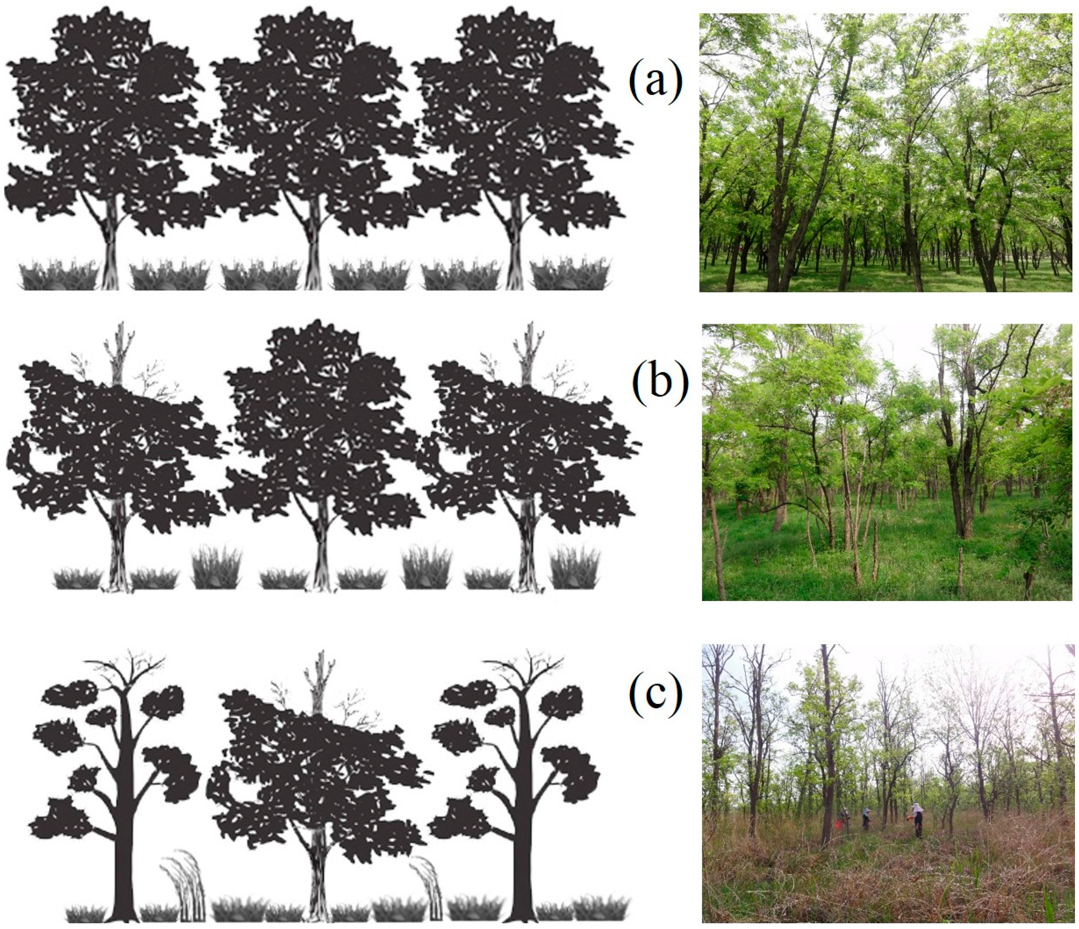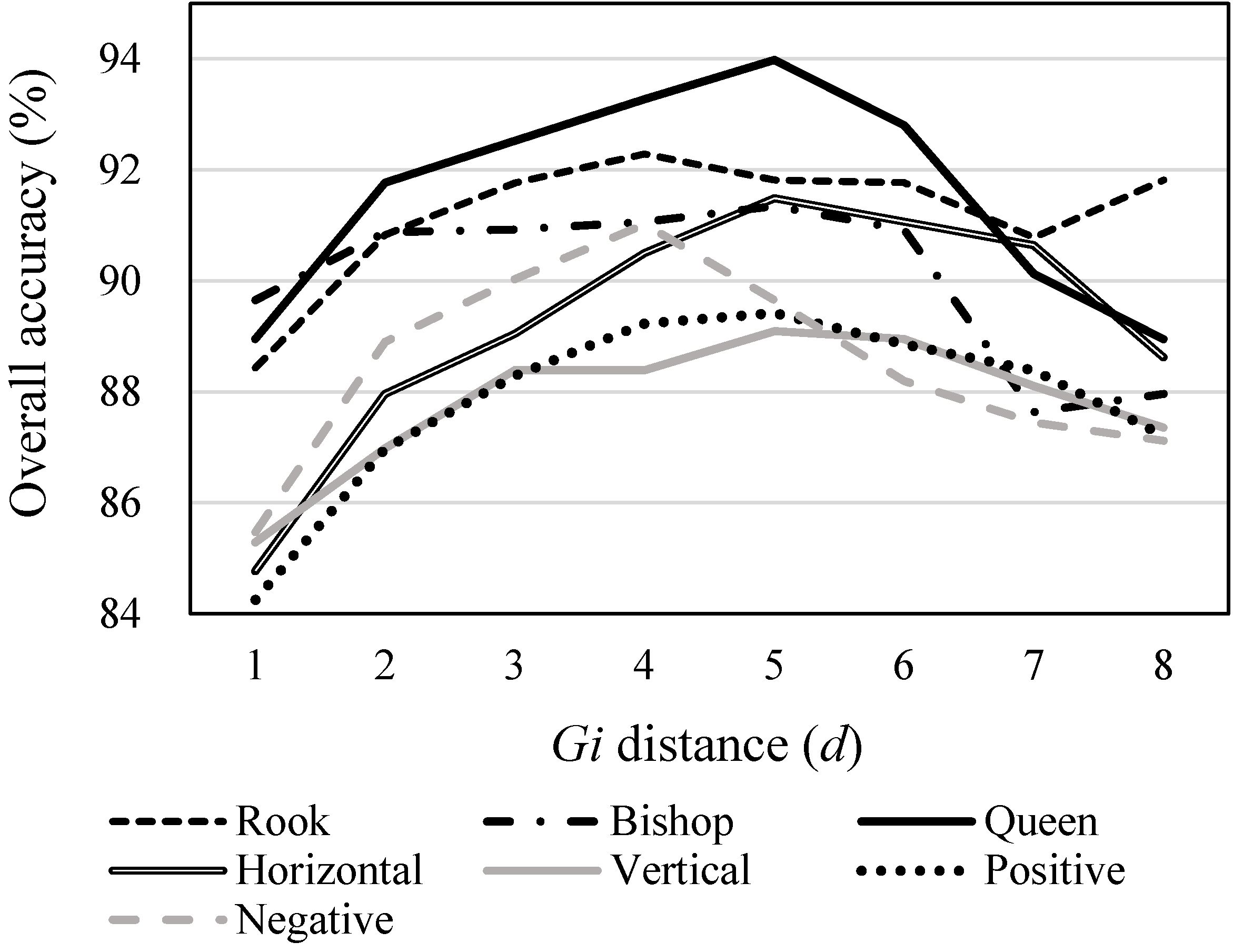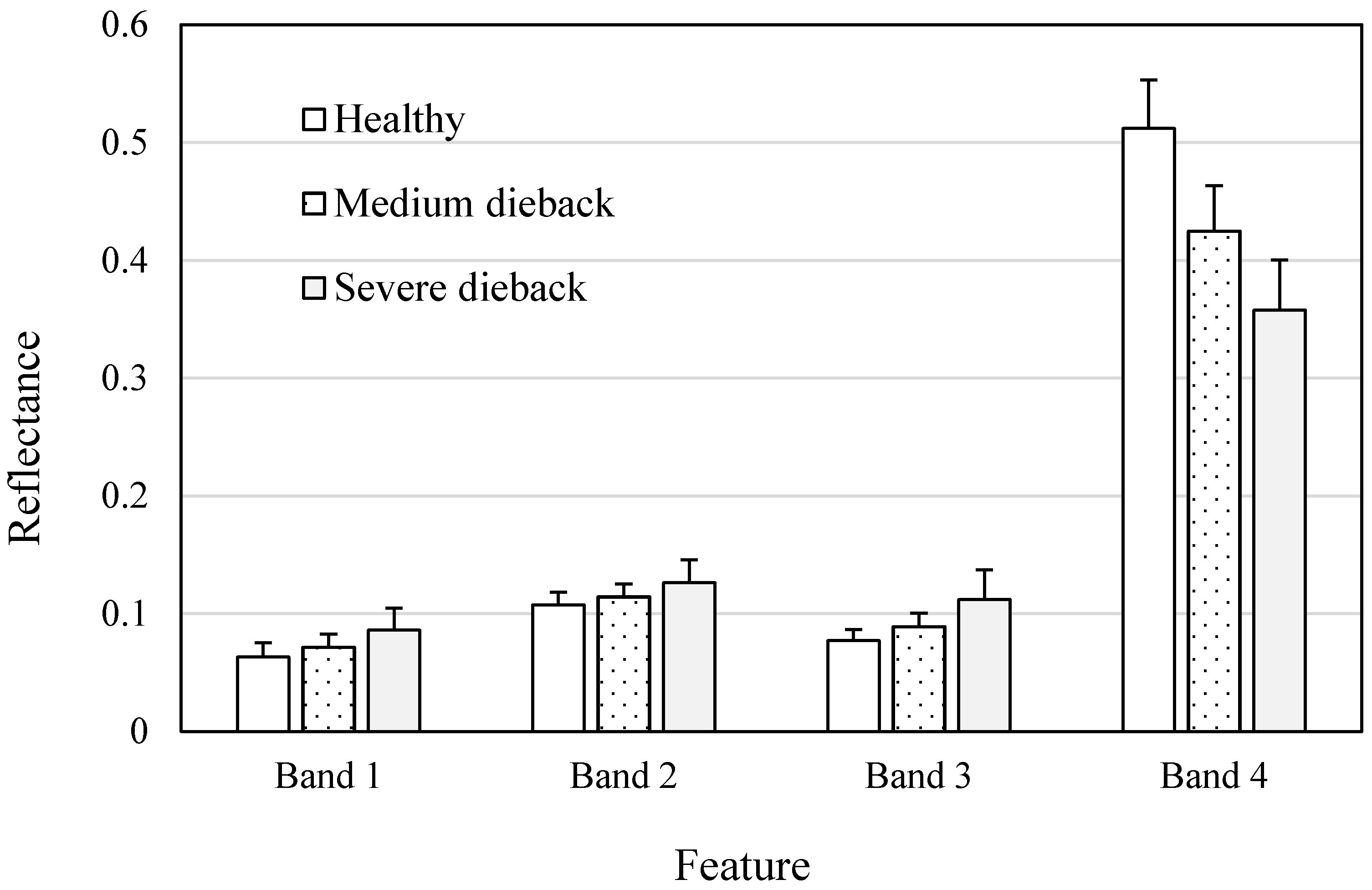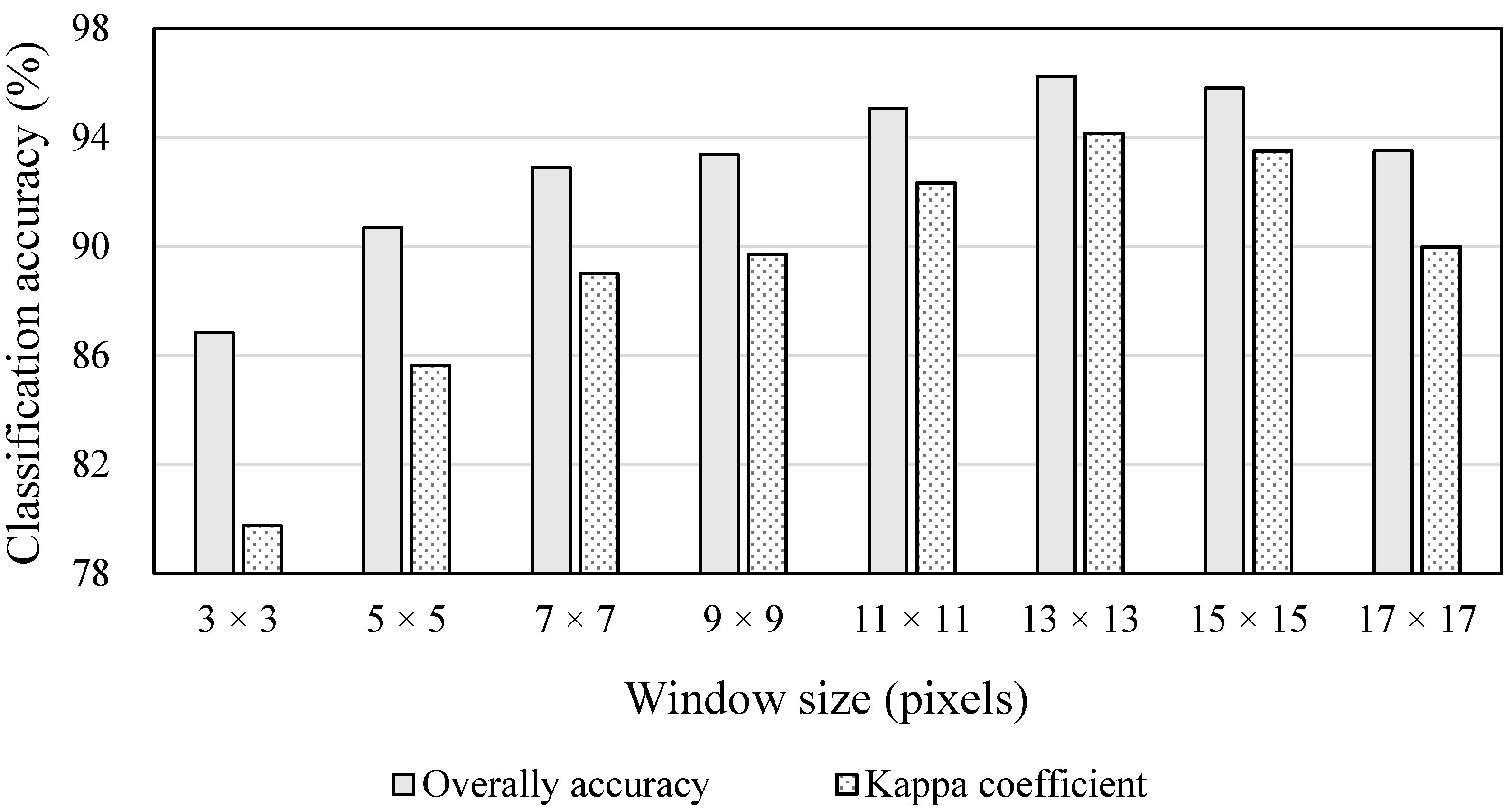 The textural and spatial information extracted from very high resolution (VHR) remote sensing imagery provides complementary information for applications in which the spectral information is not sufficient for identification of spectrally similar landscape features. In this study grey-level co-occurrence matrix (GLCM) textures and a local statistical analysis Getis statistic (Gi), computed from IKONOS multispectral (MS) imagery acquired from the Yellow River Delta in China, along with a random forest (RF) classifier, were used to discriminate Robina pseudoacacia tree health levels. Specifically, eight GLCM texture features (mean, variance, homogeneity, dissimilarity, contrast, entropy, angular second moment, and correlation) were first calculated from IKONOS NIR band (Band 4) to determine an optimal window size (13 × 13) and an optimal direction (45°). Then, the optimal window size and direction were applied to the three other IKONOS MS bands (blue, green, and red) for calculating the eight GLCM textures. Next, an optimal distance value (5) and an optimal neighborhood rule (Queen’s case) were determined for calculating the four Gi features from the four IKONOS MS bands. Finally, different RF classification results of the three forest health conditions were created: (1) an overall accuracy (OA) of 79.5% produced using the four MS band reflectances only; (2) an OA of 97.1% created with the eight GLCM features calculated from IKONOS Band 4 with the optimal window size of 13 × 13 and direction 45°; (3) an OA of 93.3% created with the all 32 GLCM features calculated from the four IKONOS MS bands with a window size of 13 × 13 and direction of 45°; (4) an OA of 94.0% created using the four Gi features calculated from the four IKONOS MS bands with the optimal distance value of 5 and Queen’s neighborhood rule; and (5) an OA of 96.9% created with the combined 16 spectral (four), spatial (four), and textural (eight) features. The most important feature ranked by RF classifier was GLCM texture mean calculated from Band 4, followed by Gi feature calculated from Band 4. The experimental results demonstrate that (a) both textural and spatial information was more useful than spectral information in determining the Robina pseudoacacia forest health conditions; and (b) the IKONOS NIR band was more powerful than visible bands in quantifying varying degrees of forest crown dieback. View Full-Text