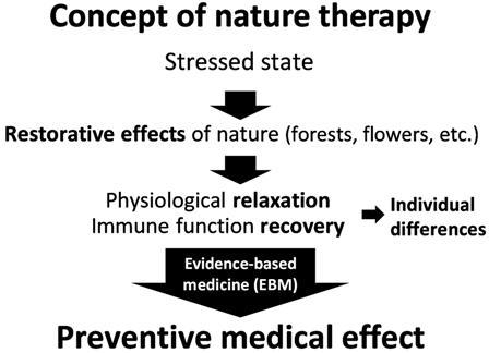Humans have evolved into what they are today after the passage of 6–7 million years. If we define the beginning of urbanization as the rise of the industrial revolution, less than 0.01% of our species’ history has been spent in modern surroundings. Humans have spent over 99.99% of their time living in the natural environment. The gap between the natural setting, for which our physiological functions are adapted, and the highly urbanized and artificial setting that we inhabit is a contributing cause of the “stress state” in modern people. In recent years, scientific evidence supporting the physiological effects of relaxation caused by natural stimuli has accumulated. This review aimed to objectively demonstrate the physiological effects of nature therapy. We have reviewed research in Japan related to the following: (1) the physiological effects of nature therapy, including those of forests, urban green space, plants, and wooden material and (2) the analyses of individual differences that arise therein. The search was conducted in the PubMed database using various keywords. We applied our inclusion/exclusion criteria and reviewed 52 articles. Scientific data assessing physiological indicators, such as brain activity, autonomic nervous activity, endocrine activity, and immune activity, are accumulating from field and laboratory experiments. We believe that nature therapy will play an increasingly important role in preventive medicine in the future. View Full-Text