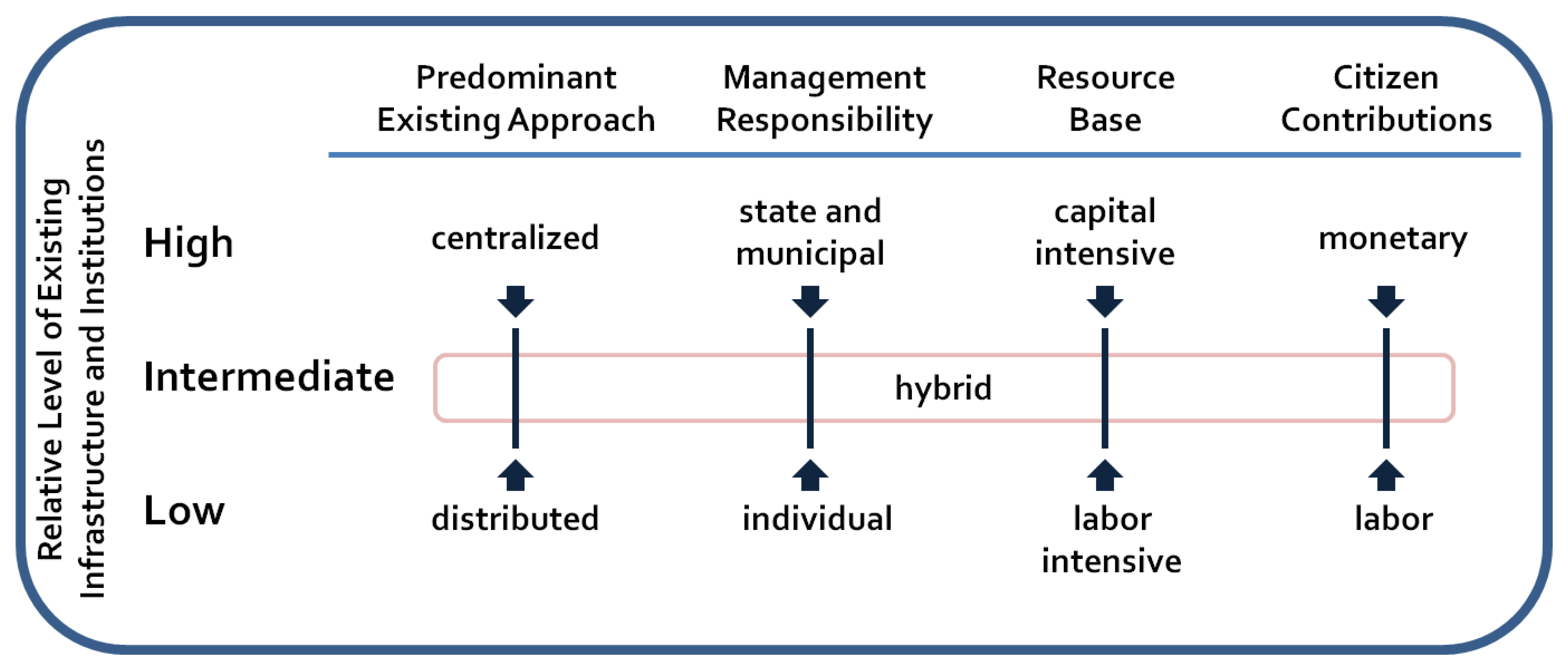 Urban stormwater infrastructure traditionally promoted conveyance. Cities are increasingly designing stormwater infrastructure that integrates both conveyance and infiltration in hybrid systems to achieve public health, safety, environmental, and social goals. In addition, cities face decisions about distribution of responsibilities for stormwater management and maintenance between institutions and landowners. Hybrid governance structures combine centralized and distributed management to facilitate planning, operations, funding, and maintenance. Effective governance in any management approach will require changes in the expertise of stormwater agencies. Recognizing the distinction between hybrid infrastructure and hybrid governance is important in long-term planning decisions for construction and management of stormwater systems. A framework is presented that relates the level and type of existing stormwater infrastructure with available capital, institutional development, and predominant citizen contributions. Cities with extensive existing infrastructure are increasingly integrating distributed, “green” approaches that promote infiltration, and must improve institutional expertise for governance decisions. For cities with little existing infrastructure, landowner management often dominates, especially when municipalities cannot keep pace with rapid growth. In between, rapidly industrializing cities are positioned to use growing capital resources to fund both conveyance and infiltration measures based on current design principles. For all cities, local management innovations, including decisions regarding public engagement, will be critical in shaping future urban stormwater systems. View Full-Text